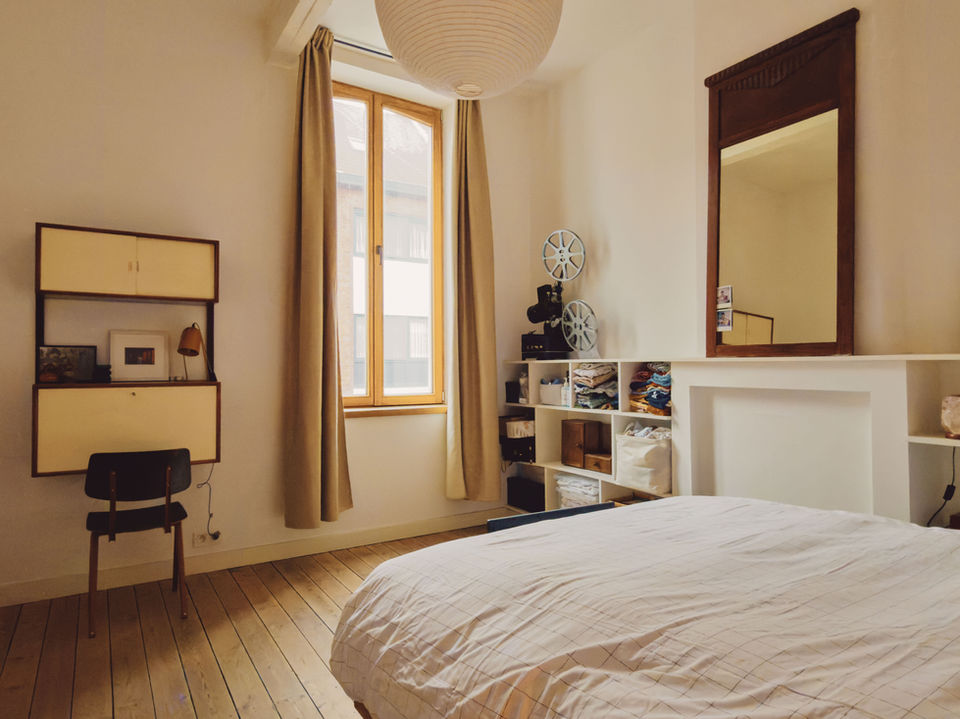 Op de eerste verdieping is er een open ruimte die wij gebruiken als avondliving: films kijken op de projector en languit in de zetel, een extra leefplek die je evengoed als bureau, hobbyruimte of speelruimte kan invullen. Daarnaast ligt een grote slaapkamer die nu dienstdoet als master bedroom, maar vroeger ook perfect werkte als ruime werkplek.